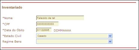 Informe dados do inventariado, tais como: nome, CPF, data do óbito, estado civil, e, dependendo desse último, o regime de bens.