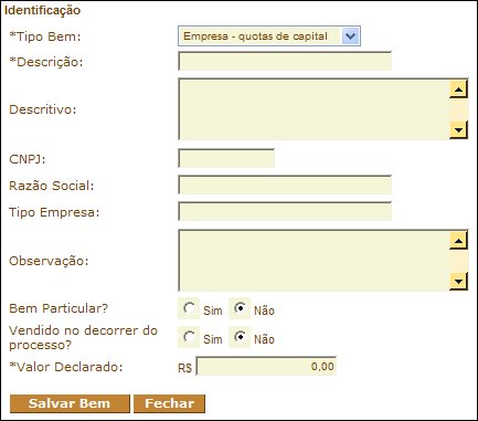 Para os bens do tipo empresa, devem ser informados alguns dados adicionais, como Razão Social, CNPJ e tipo de empresa.