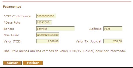 Informe o CPF e data do pagamento, número da guia, banco e agência, o valor do ITCD (cód 102) e da taxa judiciária (cód 205) pagos em valores históricos(o sistema efetua a atualização monetária), se houver necessidade de um pagamento complementar o sistema abate os pagamentos informados e disponibiliza uma Guia.